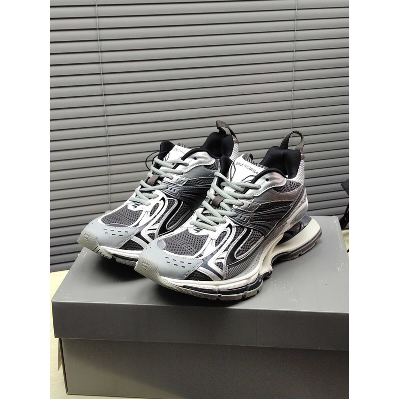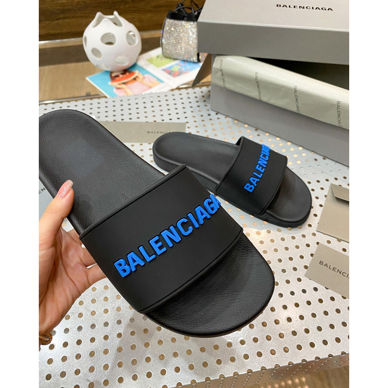 Ba*len*cia*ga pool slide sandal in black rubber with blue 3d Ba*len*cia*ga logo