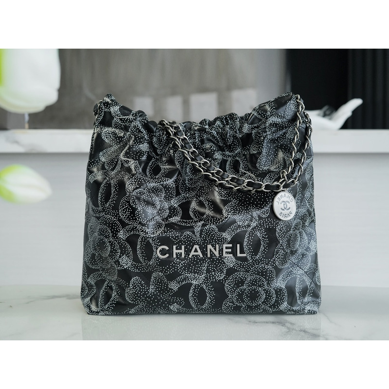 Ch*el 22 handbag printed calfskin & silver-tone metal black & white