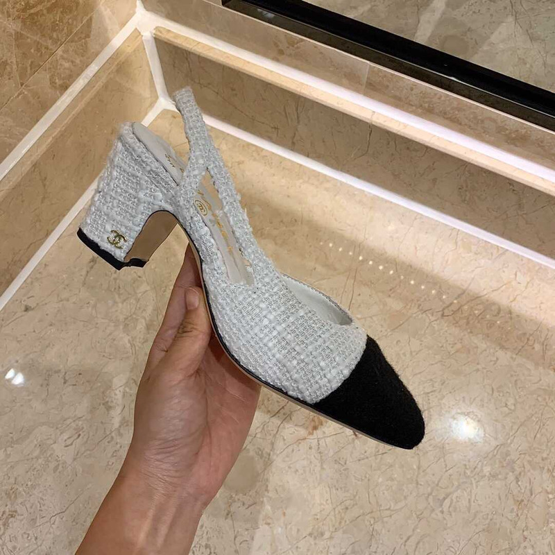 Ch*el classic sandals sheepskin mid-heel sandals white and black