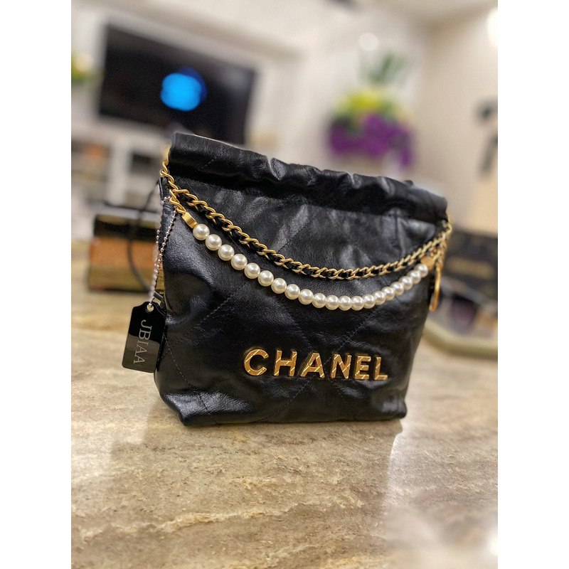 Ch*el shiny crumpled calfskin with pearl chain Ch*el 22 black