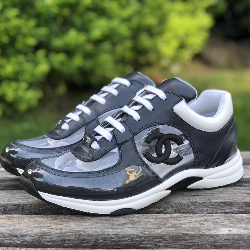 Ch*el nylon suede calfskin printed cc sneakers white black