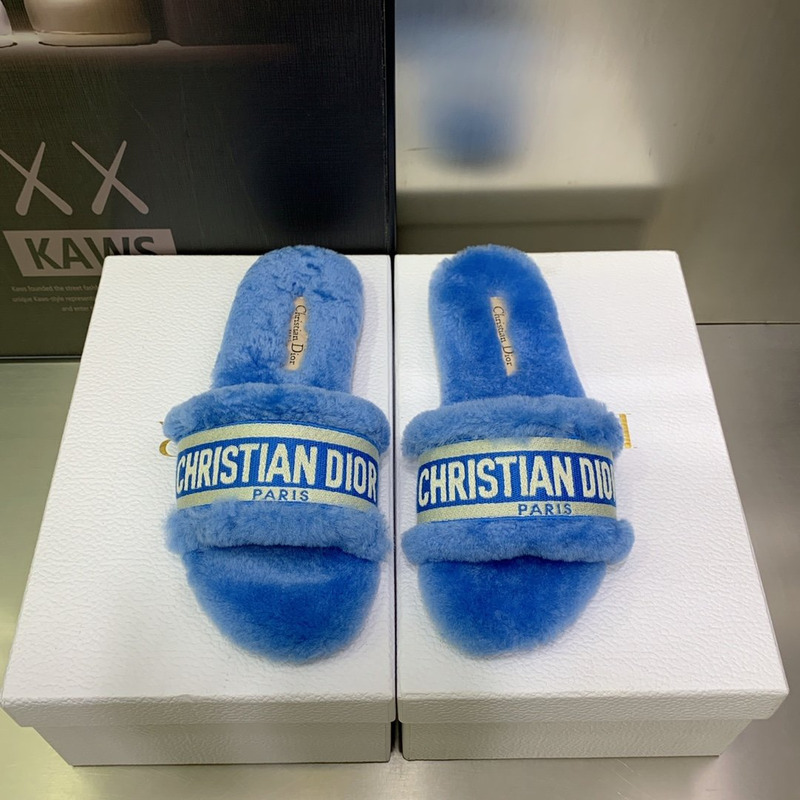 D*or chez moi slides embroidered cotton and shearling bright blue