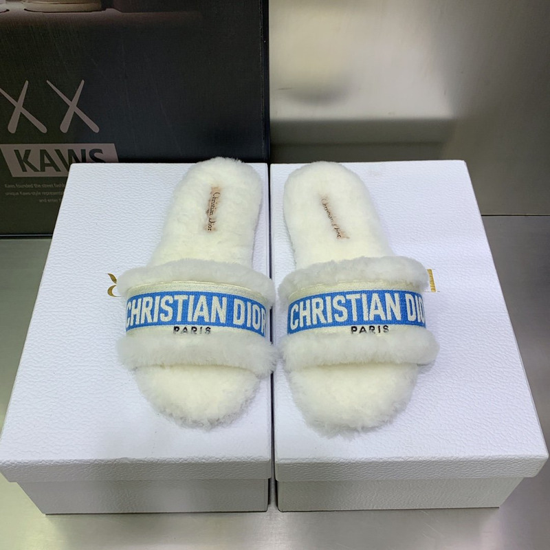 D*or chez moi slides embroidered cotton and shearling white&blue