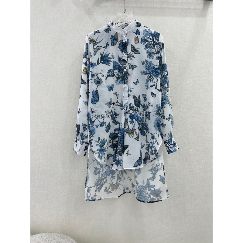 D*or blouse white and pastel midnight blue cotton voile with toile de jouy mexico motif