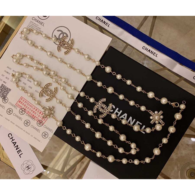 Ch*el pearl necklace double length with interlocking c logo light gold