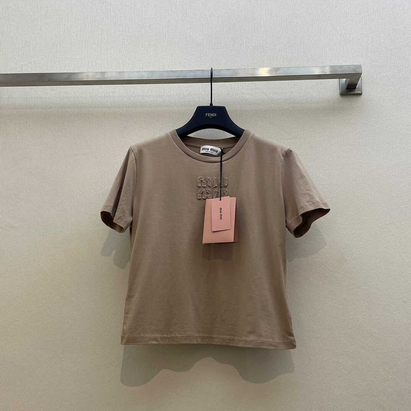 Miu Miu Garment-dyed Embroidered Logo Knitted T-shirt Brown