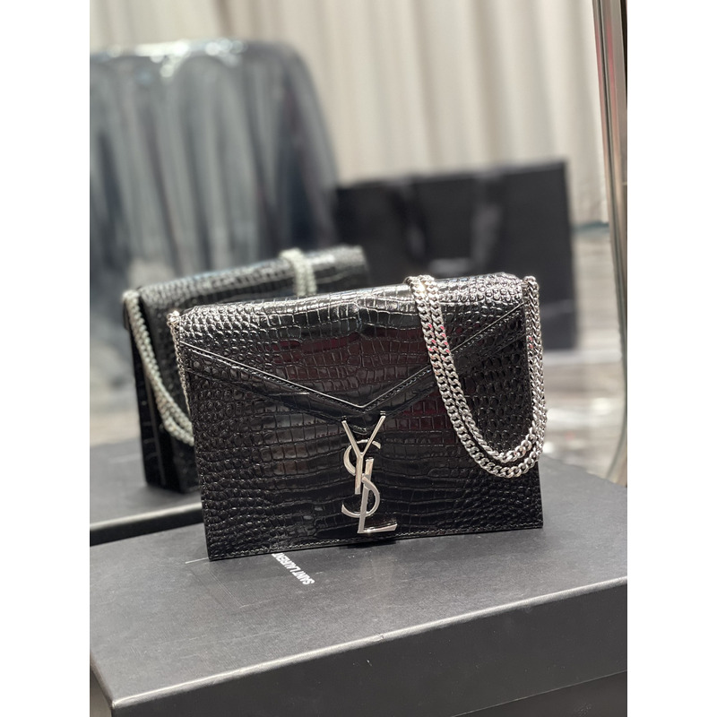 Saint Laurent Cassandra Medium Chain Bag In crocodile Embossed Shiny Leather Black