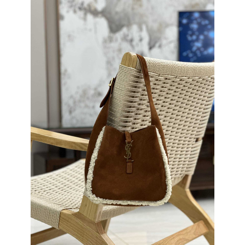 Saint Laurent Le 5 À 7 Hobo Bag In Suede And Shearling Dark Cigar And Natural Beige