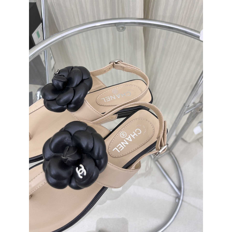 Ch*el black & cream camellia flower jelly sandals beige