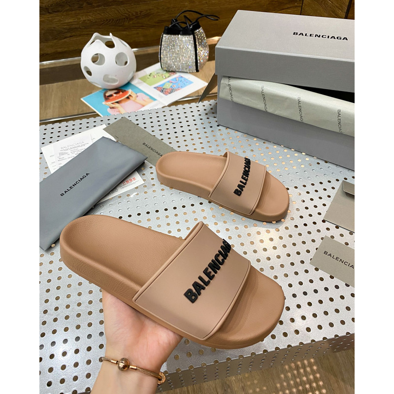 Ba*len*cia*ga pool slide sandal in beige smooth rubber with black 3d Ba*len*cia*ga logo